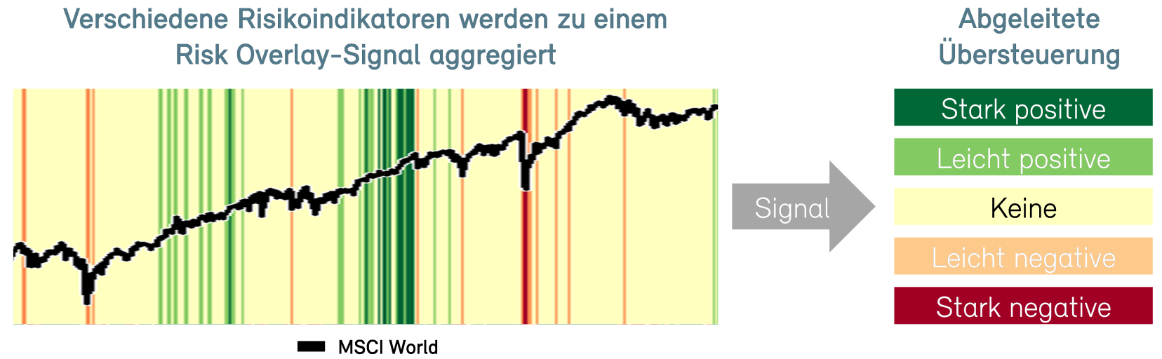 Aktienmarktrisiken kündigen sich jedoch nicht immer lange im Voraus an, sondern können sehr kurzfristig auftreten. Genauso wie an einem schönen Sommertag plötzlich ein Gewitter aufziehen und den Grillplausch vermiesen kann. Um auch für diese Situation gewappnet zu sein, werden zusätzliche Indikatoren beobachtet und zu einem täglichen Risikosignal aggregiert. Schlägt dieses Alarm, wird die Basisallokation übersteuert und so kurzfristig die Aktienquote angepasst.