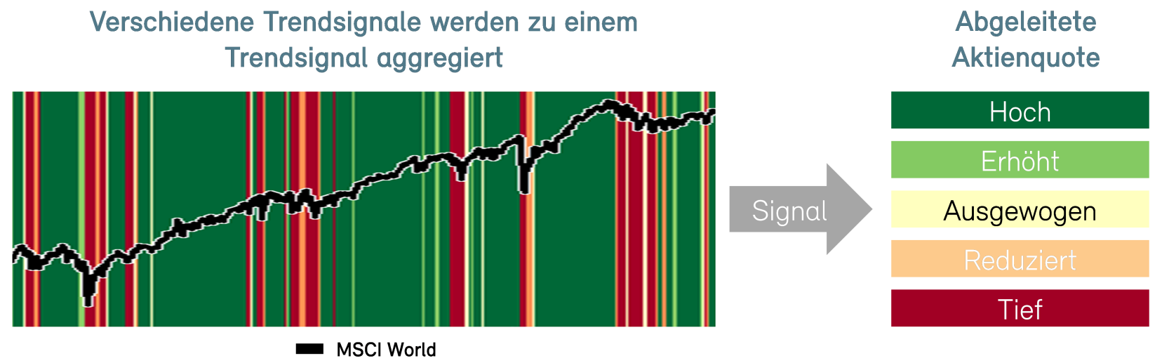 Die dynamische Steuerung der Aktienquote erfolgt mit System und basiert auf wissenschaftlichen Evidenzen und neusten Methoden. Ähnlich wie bei der Prognose des Wetters werden verschiedene Trendsignale aggregiert und daraus die Basisallokation abgeleitet. Die Trendsignale dienen als Risikosignale für die Grundausrichtung – sozusagen zur Bestimmung der Grosswetterlage.