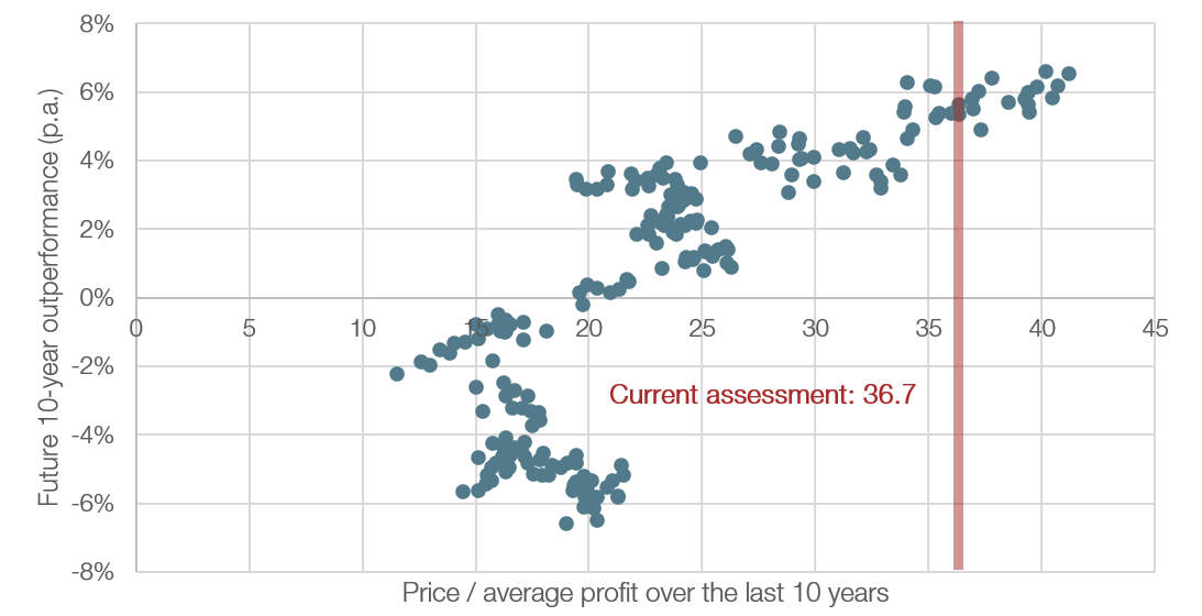 This correlation has been empirically proven in a large number of academic publications. One of the best-known papers on this subject was written by Campbell and Shiller (1998)* and shows that the relationship between current valuations and future 10-year returns is linearly declining.