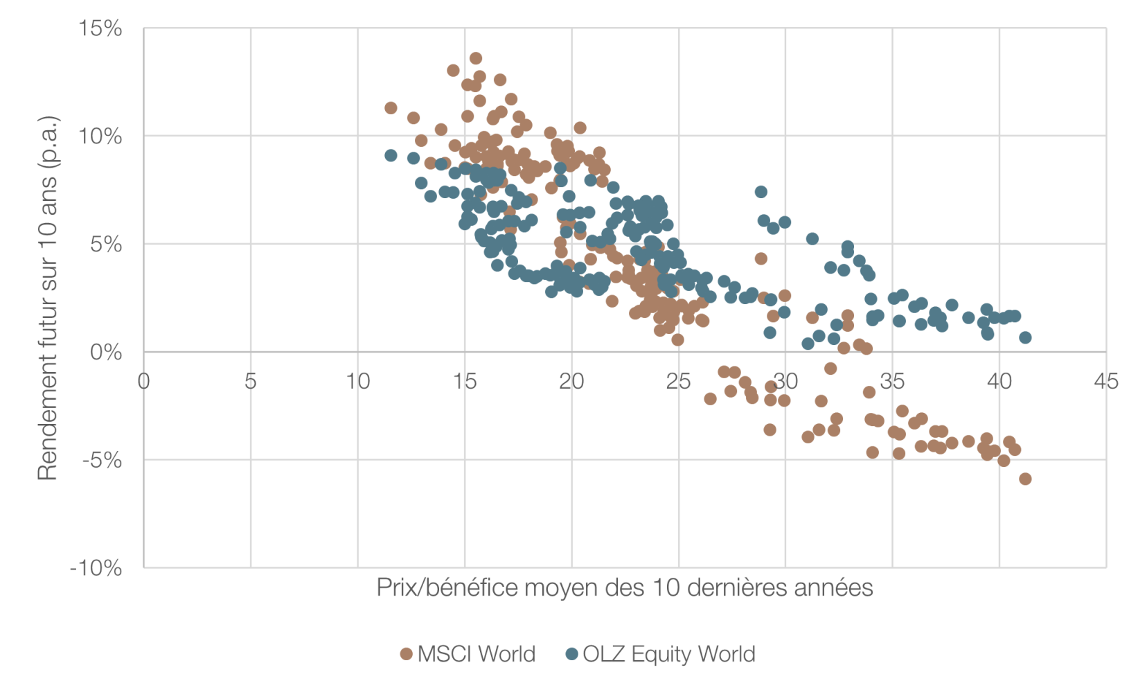 Afin de comprendre comment l'optimisation des risques OLZ se comporte par rapport à la valorisation du MSCI World, nous avons examiné, à l'instar de la méthodologie de Campbell et Shiller, la valorisation du MSCI World en relation avec le rendement futur sur 10 ans du MSCI World et du fonds OLZ Equity World Optimized, axé sur la réduction des risques.