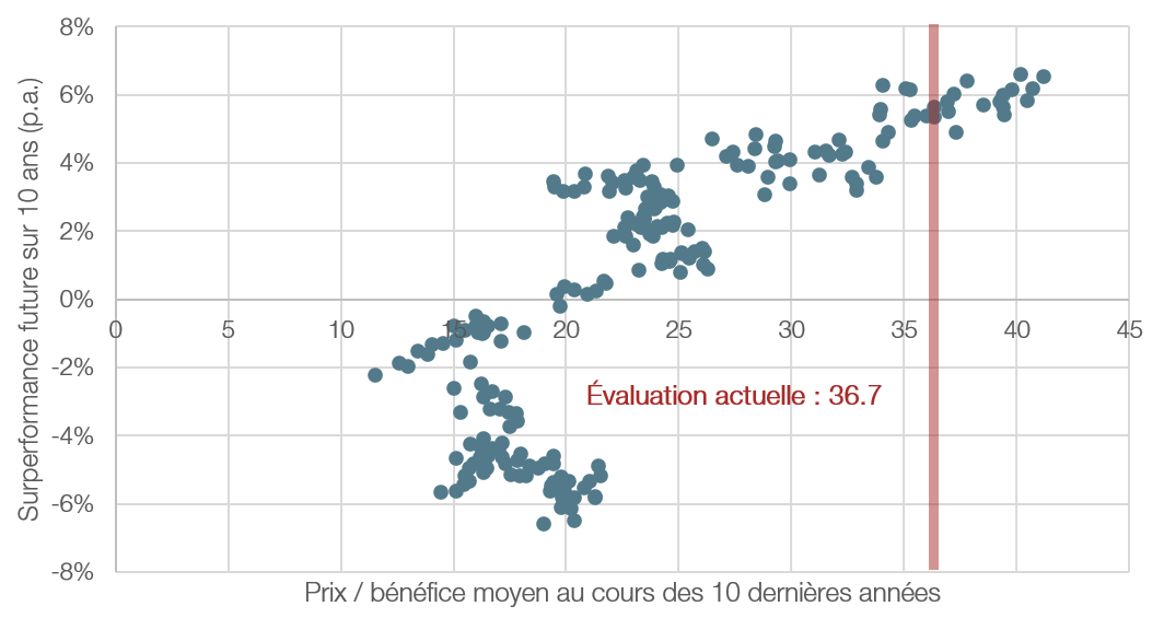 Dans la recherche universitaire, cette corrélation a été prouvée empiriquement dans de nombreuses publications. L'un des articles les plus connus à ce sujet a été rédigé par Campbell et Shiller (1998)* et montre que la relation entre la valorisation actuelle et le rendement futur sur 10 ans est linéairement décroissante.
