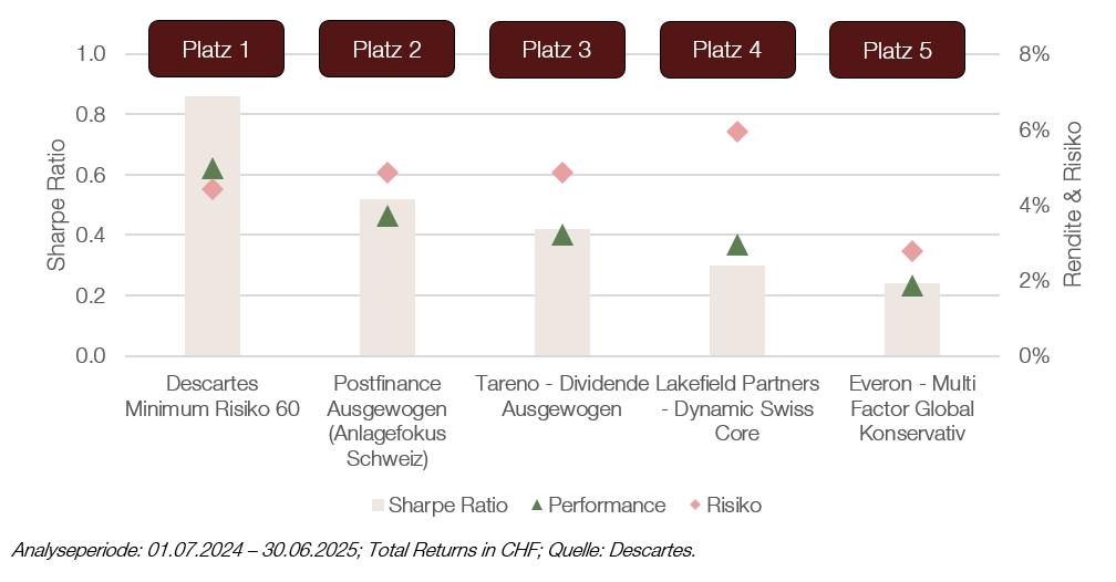 Die Descartes Minimum Risiko 60 Strategie konnte nicht nur risikoadjustiert, sondern auch absolut betrachtet die beste Performance in den vergangenen 12 Monaten erwirtschaften und setzte sich in der Kategorie «Konservativ» gegenüber den Konkurrenten durch.