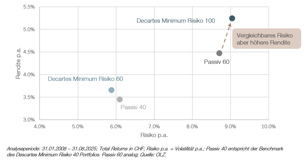 Dieser Logik folgend ist das Descartes Minimum Risiko 100 Portfolio aufgrund seines vergleichbaren Risikoprofils die faire Benchmark für das Passive 60 Portfolio. Während das Descartes 100 Portfolio eine Volatilität von 9.1% p.a. und einen maximalen Verlust von 28.3% aufweist, liegt dessen Performance mit 5.2% über der Rendite des Passiven 60 Portfolios. Damit wird deutlich: Die Risikoreduktion steigt überproportional mit der Aktienquote, sodass eine risikooptimierte 100% Aktienquote mit einer passiven 60% Aktienquote vergleichbar ist.