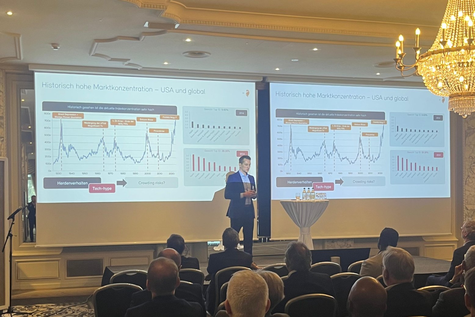 Die Anleger müssen mit diesen globalen Unsicherheiten risikobewusst umgehen. Unser Head of Investment Solutions, Dr. Patrick Walker, zeigte auf, welchen Risiken sich die Pensionskassen ausgesetzt sehen. Die Herausforderungen gehen von geopolitischen Risiken über Inflation bis hin zu Klimarisiken. Wenn man versucht, die geopolitischen Risiken zu quantifizieren, sieht man, dass sie sich auf einem hohen Niveau befinden, das nur von den beiden Weltkriegen, dem Kalten Krieg und 9/11 übertroffen wird. Mit erhöhtem politischem Risiko und steigender Marktvolatilität gingen in der Vergangenheit tiefere Aktienrenditen einher, so auch im Jahr 2022, das geprägt war vom Ukraine-Krieg und der ansteigenden Inflation. Abgesehen von diesem negativen Intermezzo liefen die Finanzmärkte in den Jahren 2023/24 vor allem aufwärts. Getrieben von den grossen Tech-Titeln der USA hat der US-Aktienmarkt in den letzten zwei Jahren überdurchschnittlich stark zugelegt. Diese Entwicklung führt zum nächsten Risiko – dem Konzentrationsrisiko. Die zehn grössten Titel im MSCI World machen mittlerweile knapp 28% aus, vor zehn Jahren waren es bloss 10%. Durch den starken Renditezuwachs stiegen auch deren P/E Ratio auf extreme Werte, ein Indiz für eine starke Überbewertung dieser Titel. Patrick Walker erläutert, welche bewährten Grundprinzipien und risikooptimierten OLZ-Fonds geeignet sind, um sich gegen diese Risiken schützen zu können.